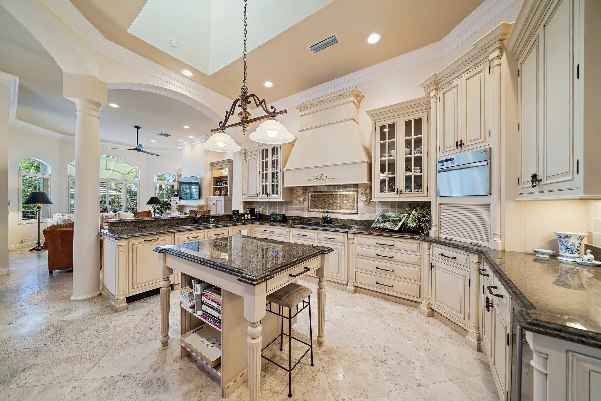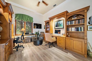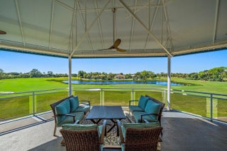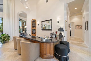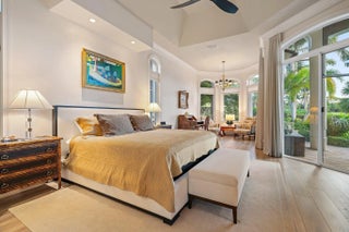 Set on a .71-acre cul-de-sac lot with sweeping golf course views, this exceptional Ironhorse estate blends comfort and timeless style. The spacious primary suite features a sitting area overlooking the pool and fairways, an oversized walk-in closet, and a well-appointed bath with separate tub, shower, and dual water closets. A nearby office includes built-ins and dual workstations. The living room with wet bar flows to formal dining, while the kitchen opens to the family and breakfast rooms with access to the patio and pool. A split plan offers private guest suites. Updates include a 2023 roof and 2021 whole-house generator. Accordion shutters throughout, with impact glass in the dining room. Ironhorse offers optional memberships, 24/7 gated security, tennis, fitness, swimming, and dining.
