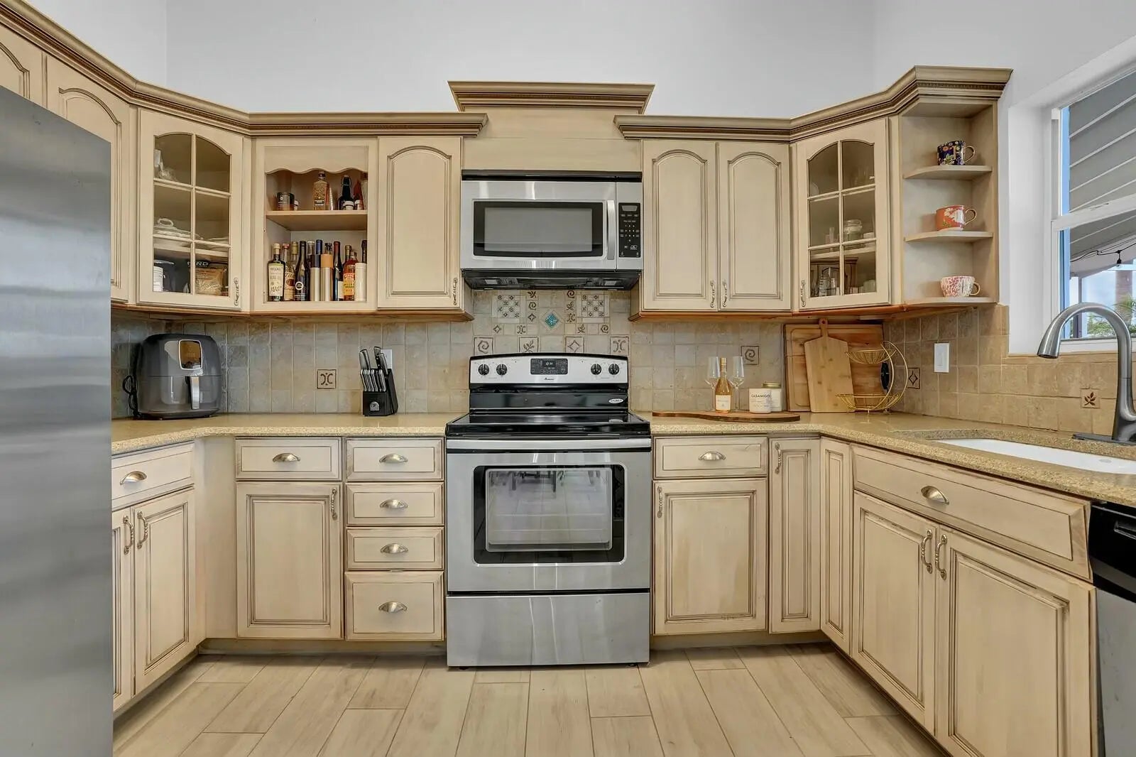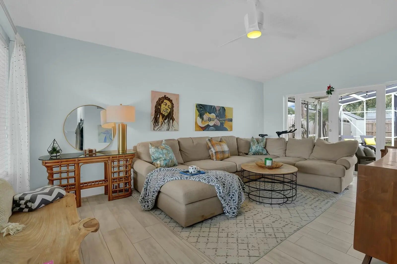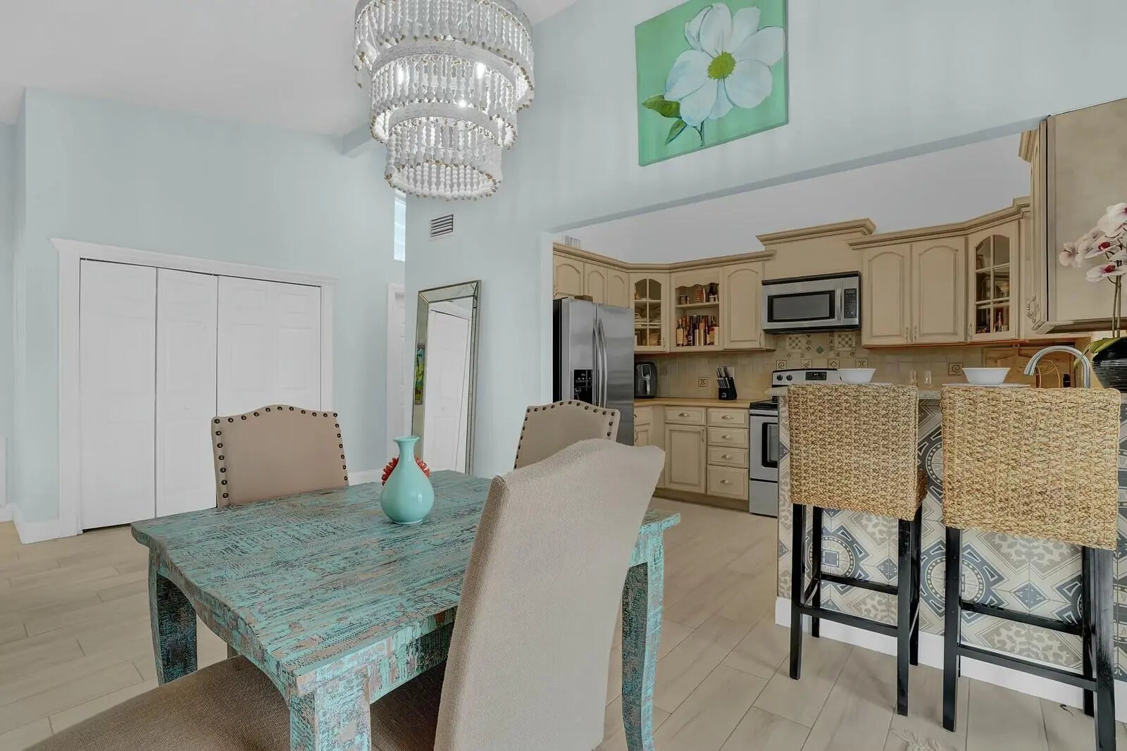 This beautifully upgraded vaulted-ceiling mid-century single-family home in Palm Beach Gardens features 3 bedrooms and 2 bathrooms, with no HOA fees. Recent renovations include a new roof (2018), solar panels (2022), HVAC (2022), upgraded plumbing, and new electrical systems (2022).The interior features coastal porcelain tile, a contemporary kitchen equipped with s/s appliances, and renovated bathrooms. It offers seamless indoor-outdoor living, highlighted by a spacious covered patio that leads to a private pool, which is enhanced by a new oversized screened enclosure, ideal for entertaining. Additional highlights include a spacious carport, extra storage, a fenced yard suitable for children and pets, new landscaping, and ambient poolside lighting. This property is truly a must-see