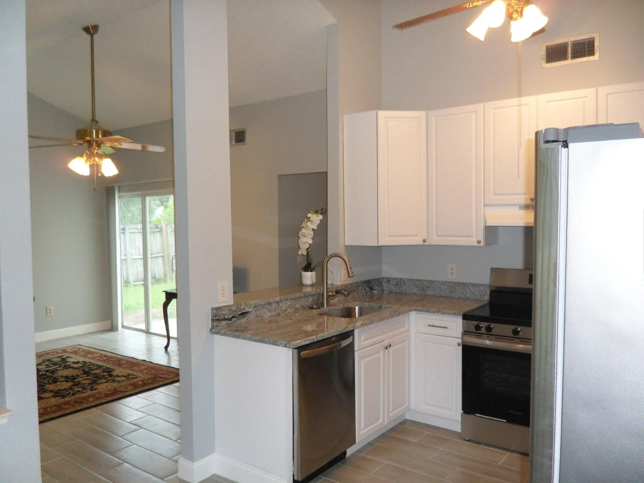 Beautifully renovated 2-bed, 2-bath home with 1-car garage and no HOA fees. Features include a new kitchen (new appliances, cabinets, granite countertops) , new bathrooms, new tile floors, vaulted ceilings, eat-in kitchen, laundry area, and shutters. Enjoy a large, fenced backyard with patio, room for a pool, and a storage shed. New A/C installed in 2021. Conveniently located off 441/SR 7--just minutes from Wellington Mall, Palm Beach Airport, Turnpike, I-95, and more. Move-in ready with exciting potential!