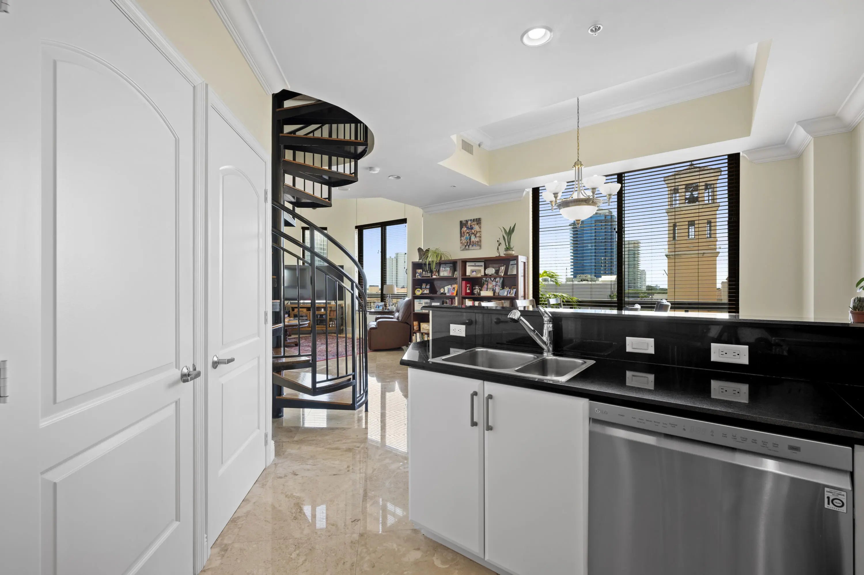 One of a kind spacious 2 story condo with 25 foot ceilings, Entire unit completely freshly painted, All new stainless steel LG appliances July '23, new water heater '23, march '23 new a/c, all marble floors and bathroom shower and countertops just re-polished, 2 inch blinds throughout unit. Amazing architectural design, balcony off dining room w/SE city and partial intracoastal views. Located in the luxurious One City Plaza in downtown WPB! Open Floor plan, complimentary valet parking for guests. 2 parking spaces in covered parking garage w/no elevator access needed. Close to City Place, dining, PBI Airport and more! This luxury building has a 17th fl roof top inground pool with views of the intracoastal and Palm Beach Island, on site manager, fitness center, sauna, steam room, 7th floo