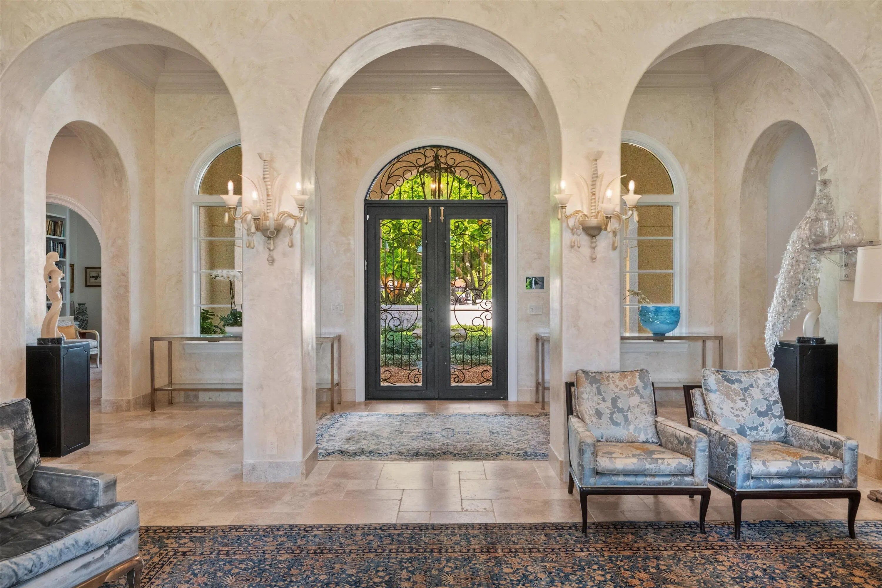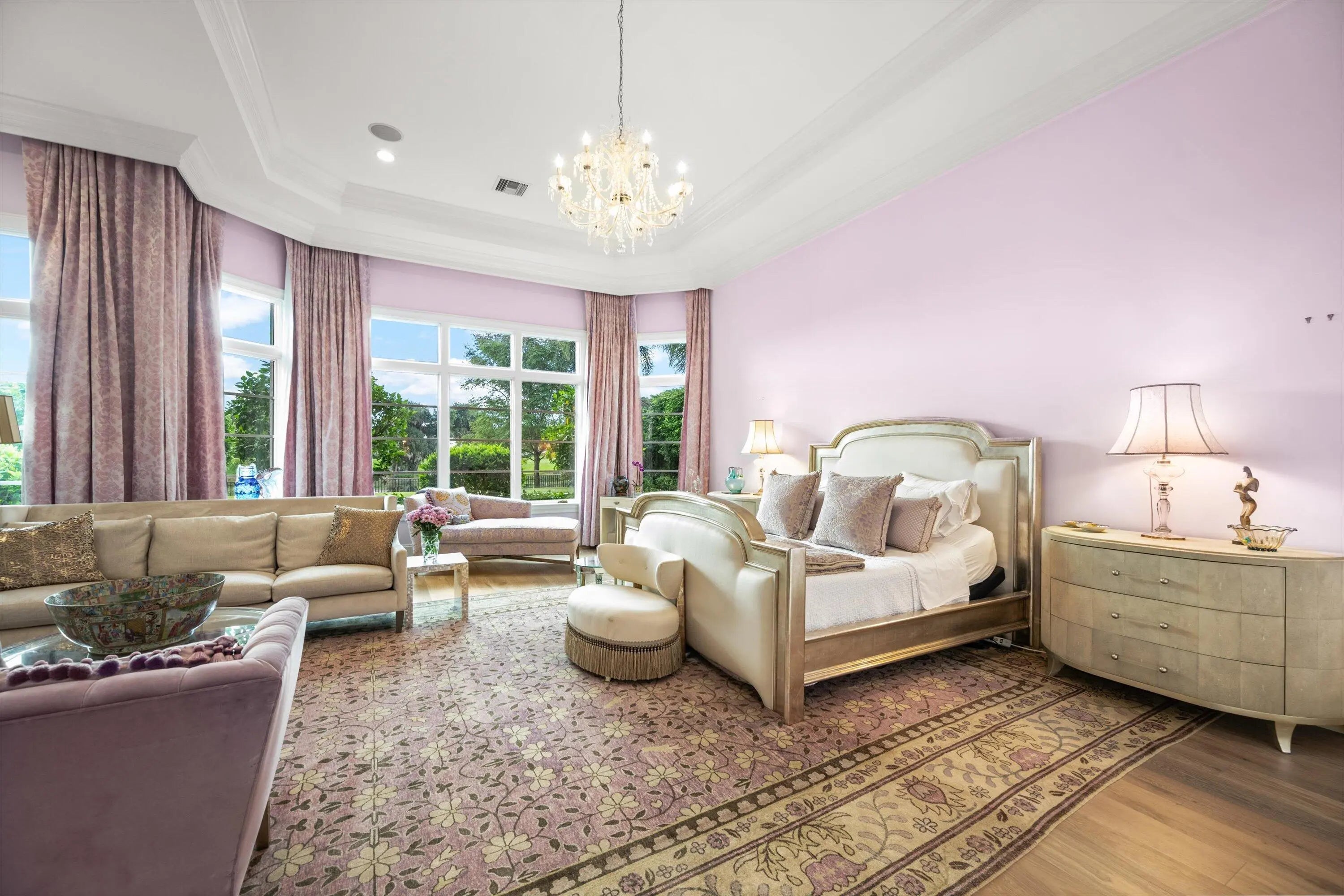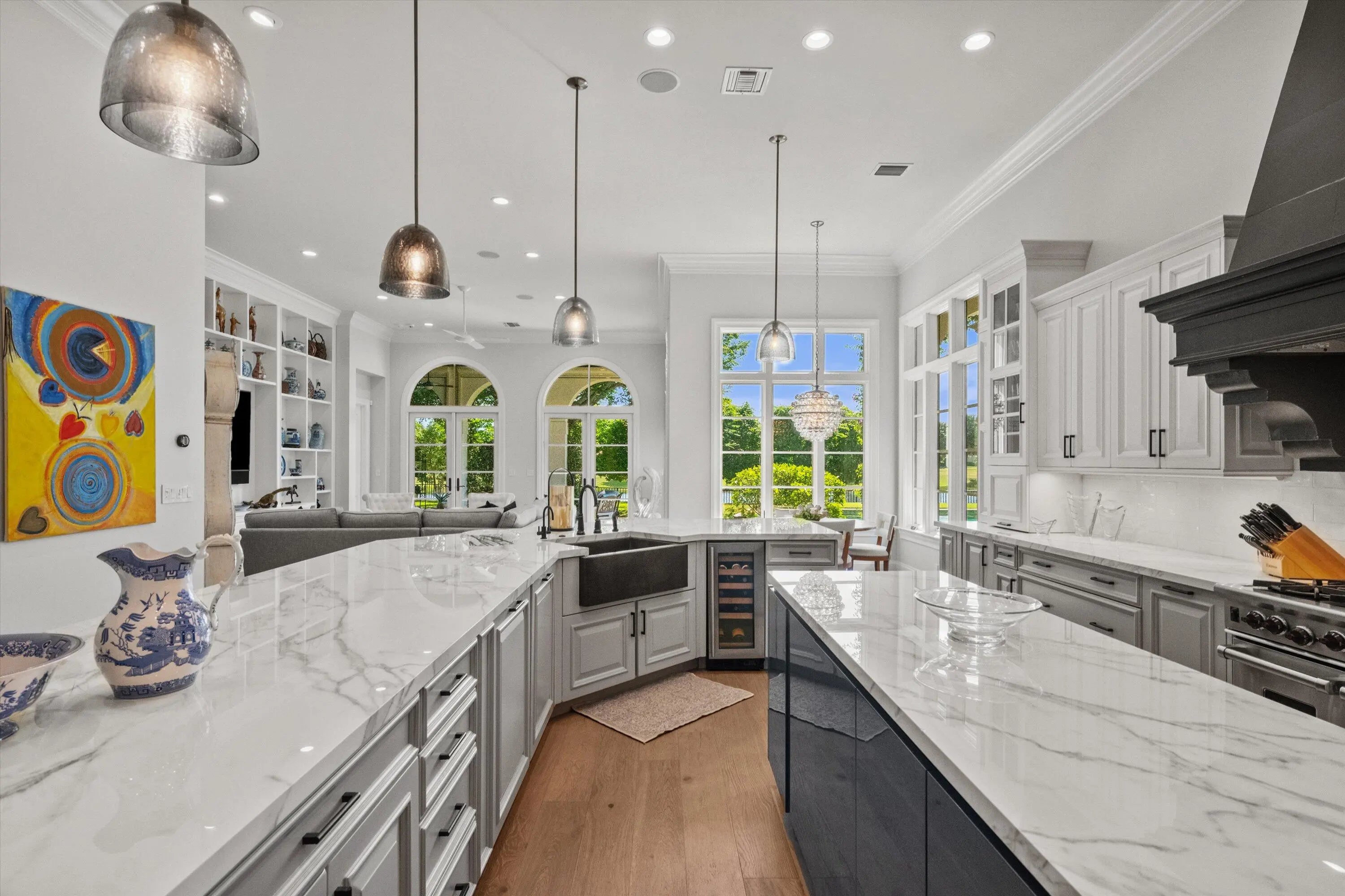 Exuding sophistication and timeless appeal, this stunning Cypress Island estate epitomizes luxury living within the prestigious Palm Beach Polo Golf and Country Club. Perfectly situated on a serene waterfront lot, the residence offers nearly 6,000 square feet of refined single-level living with 4 bedrooms, 6.5 bathrooms, and a 3-car garage.Sunlit interiors reveal a gourmet chef's kitchen appointed with Wolf appliances, a glass-enclosed walk-in wine cellar adjacent to the formal dining area, and an elegant living room anchored by a beautifully crafted fireplace. The owner's wing provides a private sanctuary featuring a sitting area, dual baths, and generous dressing spaces, while three spacious guest suites each include private baths and walk-in closets.