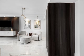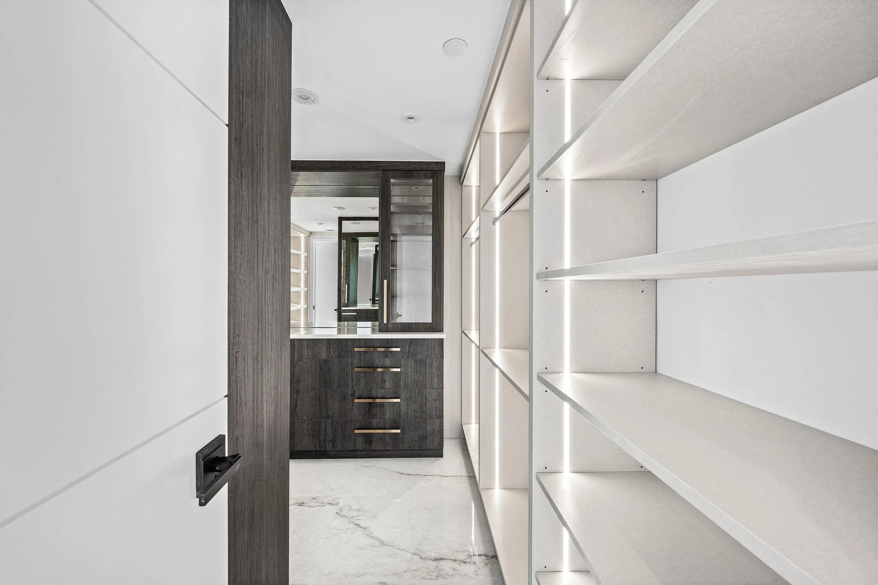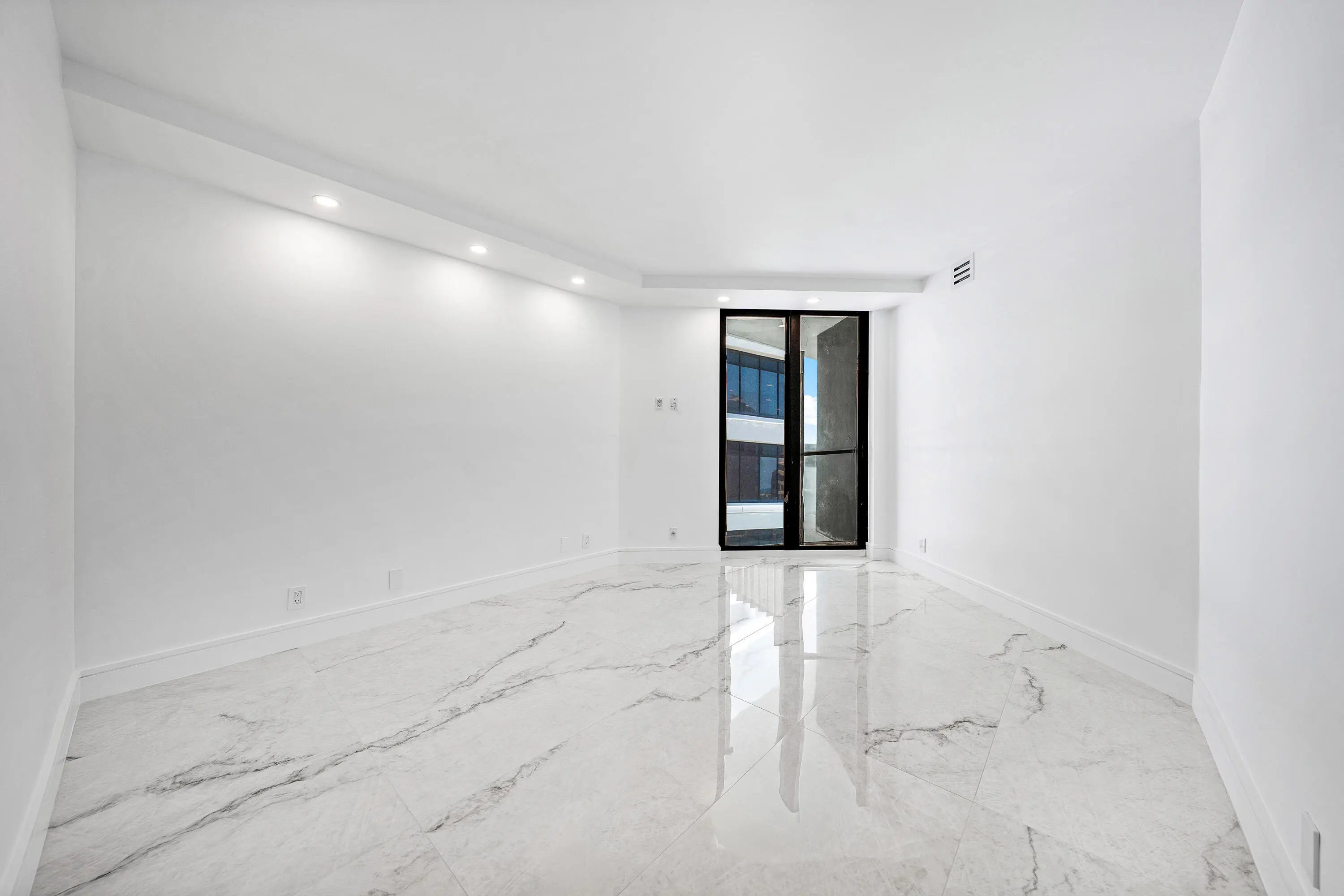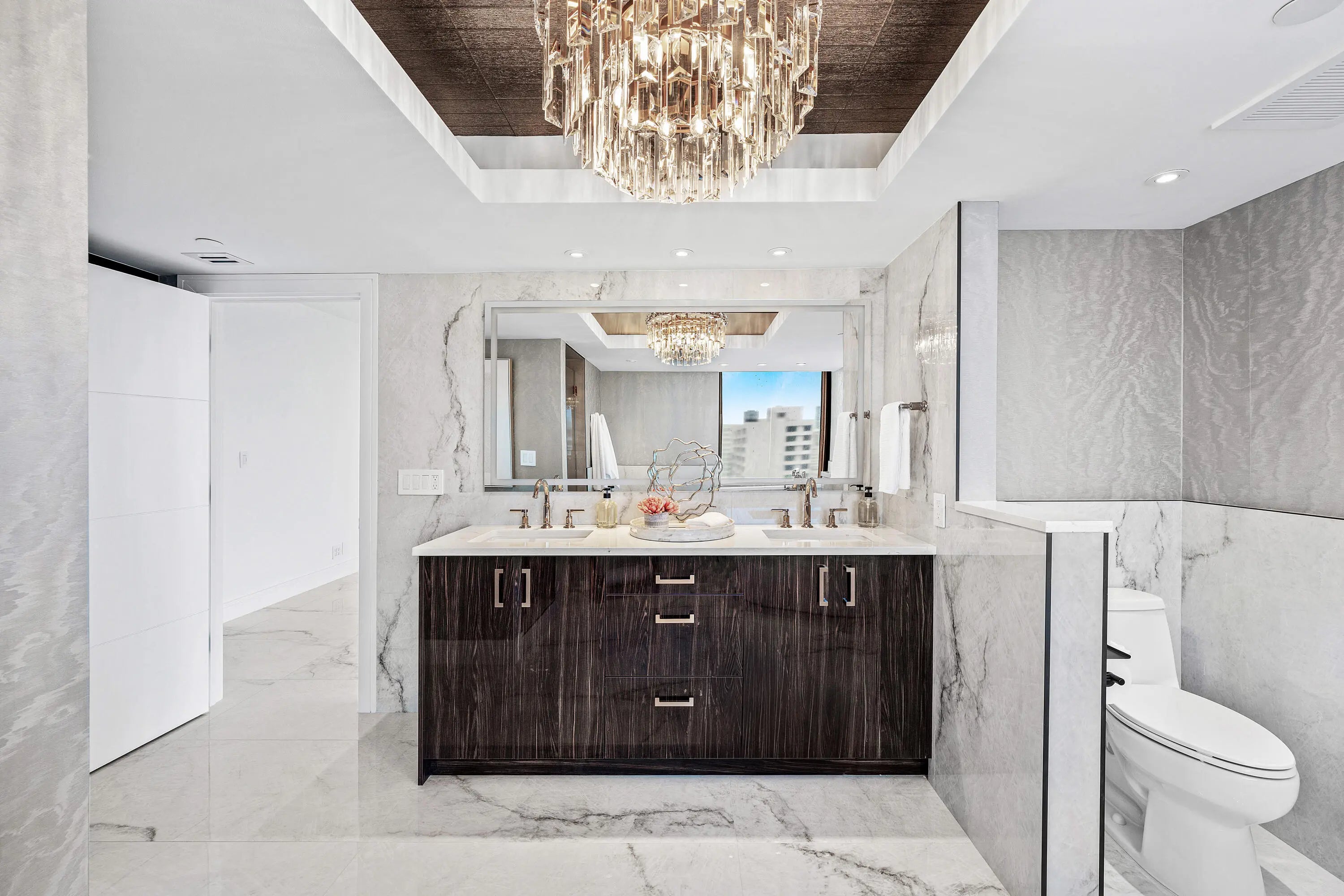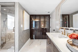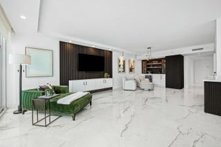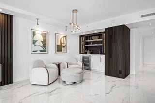 Step into a masterfully redesigned 2,091sqft residence at The Plaza, offering breathtaking ocean, intracoastal, and sunset city views from an ultra-luxury, east-to-west layout. Every inch of this home has been fully-renovated with no detail overlooked, blending modern elegance with thoughtful functionality. A grand, light-filled great room features polished porcelain tile throughout, custom fluted millwork, integrated media wall, and a designer wet bar with illuminated glass cabinetry; all capturing sweeping waterfront vistas through floor-to-ceiling impact glass. Visual Comfort lighting, art spotlights, and sleek architectural lines create an atmosphere that is as refined as it is inviting. The gourmet kitchen showcases Thermador appliances, bespoke cabinetry, backlit display elements,