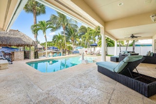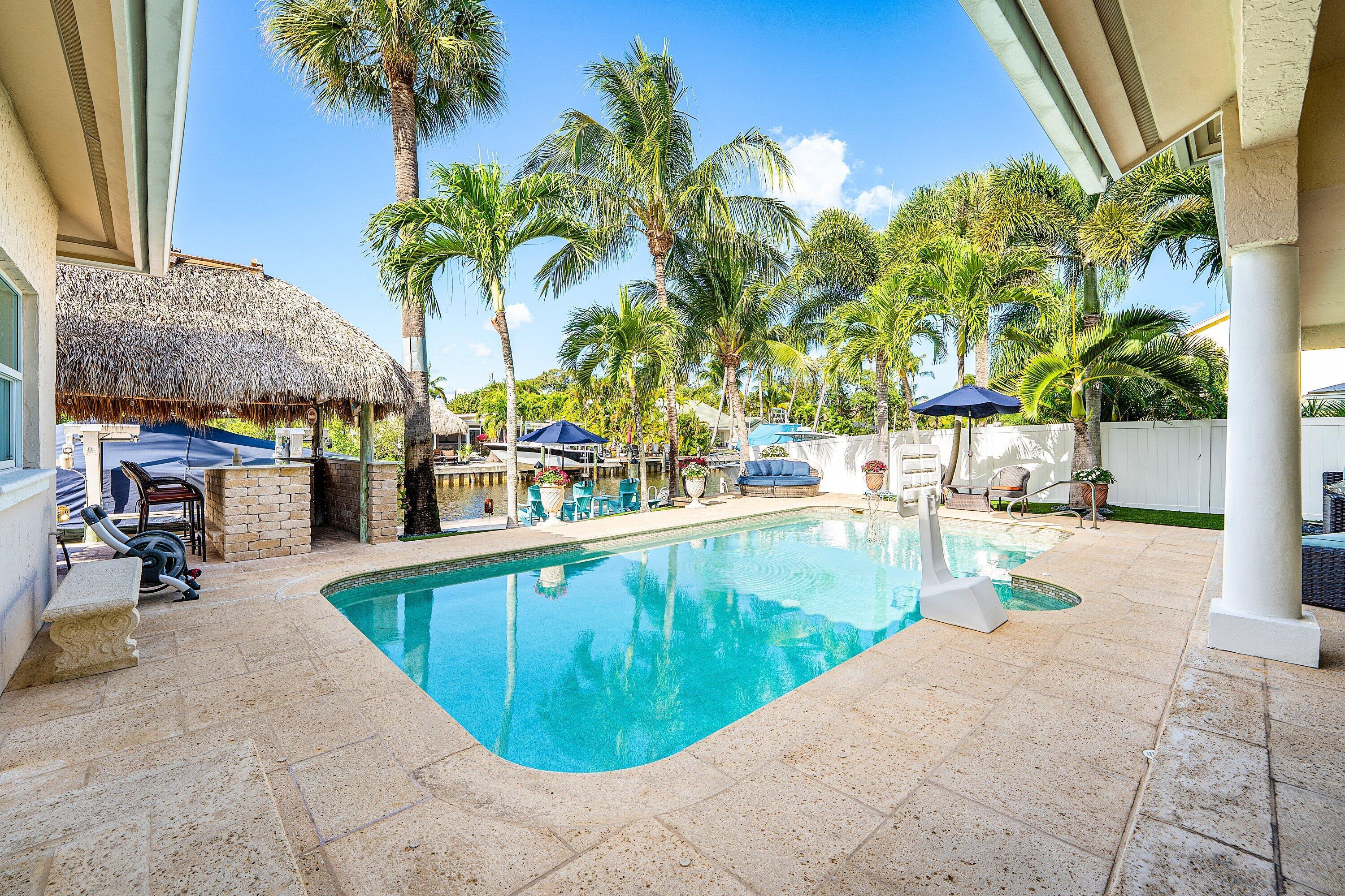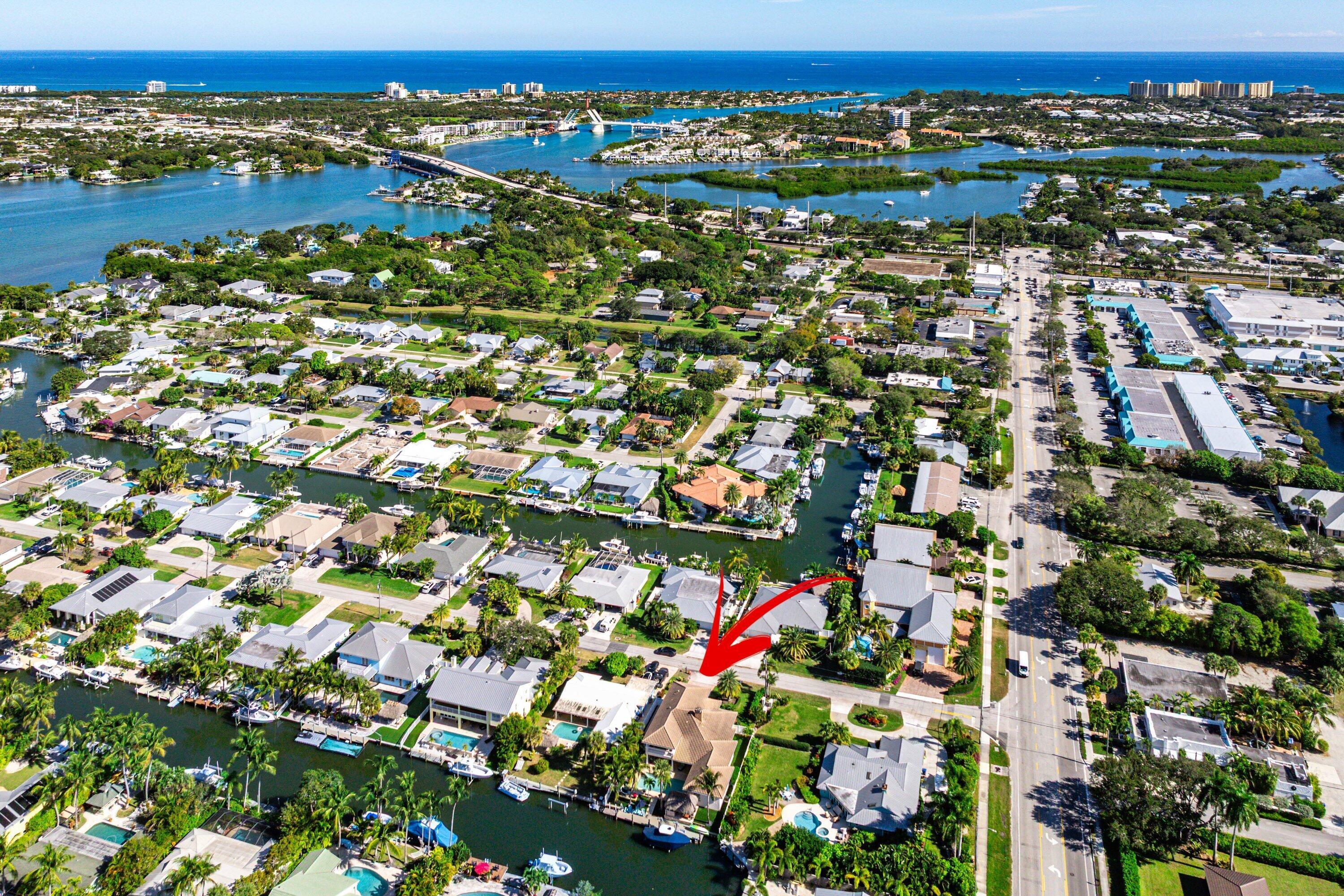 Experience elevated waterfront living in this totally remodeled CBS residence, perfectly positioned in the heart of Jupiter with tranquil canal views opening to the Loxahatchee River. This exceptional property offers 3 bedrooms and 3 baths in the main home, plus a separate 1-bedroom, 1-bath guest house complete with a full kitchen and private living area--ideal for guests, extended family, or a private retreat. A formal entry foyer sets the tone for refined interiors, featuring new tile flooring, vaulted ceilings, crown molding, recessed lighting, and a shiplap double-sided fireplace. The open kitchen is designed for both style and function, flowing seamlessly into the living area and offering a breakfast nook and countertop seating, perfect for casual dining and entertaining. More:The upstairs primary suite is a serene escape, highlighted by a large private balcony overlooking the water. Outdoor living is equally impressive with a large covered patio, expansive open patio, and private pool- creating the ultimate setting for relaxing or hosting gatherings. Boating enthusiasts will appreciate the large dock with boat lift, and quick access to the Intracoastal & Jupiter Inlet with no fixed bridges. Additional features include impact windows and doors, a 2017 barrel tile roof, and a dual A/C system. Located just minutes from pristine beaches, world-class golf and boating, top-rated shopping and dining, and convenient access to PBIA, this home delivers the quintessential South Florida lifestyle.