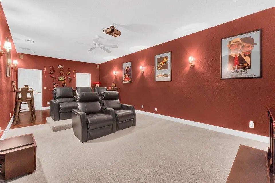 Step inside and be greeted by the grand double-door entry, soaring ceilings, and expansive windows that frame the majestic lake views. The open-concept living area is perfect for entertaining, with a gourmet kitchen featuring granite countertops, stainless steel appliances, and a spacious breakfast bar. The lavish master suite, located on the first floor, offers a serene retreat with a spa-inspired bathroom, complete with double sinks, a Roman tub, and separate shower. Additional features include: 5 spacious bedrooms + the double-sized bonus room (or 6th bedroom) is now a large movie theater. 3 full bathrooms + a powder room 2nd-floor loft. Covered lakefront patio perfect for alfresco dining. Don't miss this rare opportunity to own this furnished home. schedule a viewing today!!
