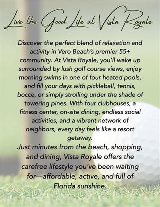 Come live the good life in Vista Royale! This first-floor 1BR/1.5BA turnkey, fully furnished residence has been beautifully renovated and is move-in ready. Features include hardwood flooring, a granite kitchen with newer appliances, new A/C, and a newly remodeled half bath. Enjoy peace of mind with impact windows and doors and the convenience of keyless entry. Custom shades accent the private enclosed patio, perfect for relaxing year-round. Located in a 55+ community offering a wide array of resort-style amenities. Rent includes water, sewer, trash, cable, and internet.