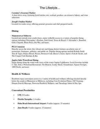 One of only 20 exclusive condo residences w/private access located above the shops, this residence at The Residences at Midtown offers a truly connected, effortless, and fun lifestyle. Pristine with a furnished option available, the home is filled with light, bright coastal energy and abundant natural light. Solid CBS construction with hurricane-impact glass provides peace of mind for both part-time and full-time living. Features include stainless appliances with a new refrigerator, top-of-the-line washer and dryer, and FULL transferable home warranty. Enjoy true live-work-play convenience with shops, cafes, fitness studios, and dining just downstairs, plus nearby green spaces, lakes, and parks. Walk to the GreenMarket, grocery, & popular restaurants. Minutes to beaches, Inlet & PBI.