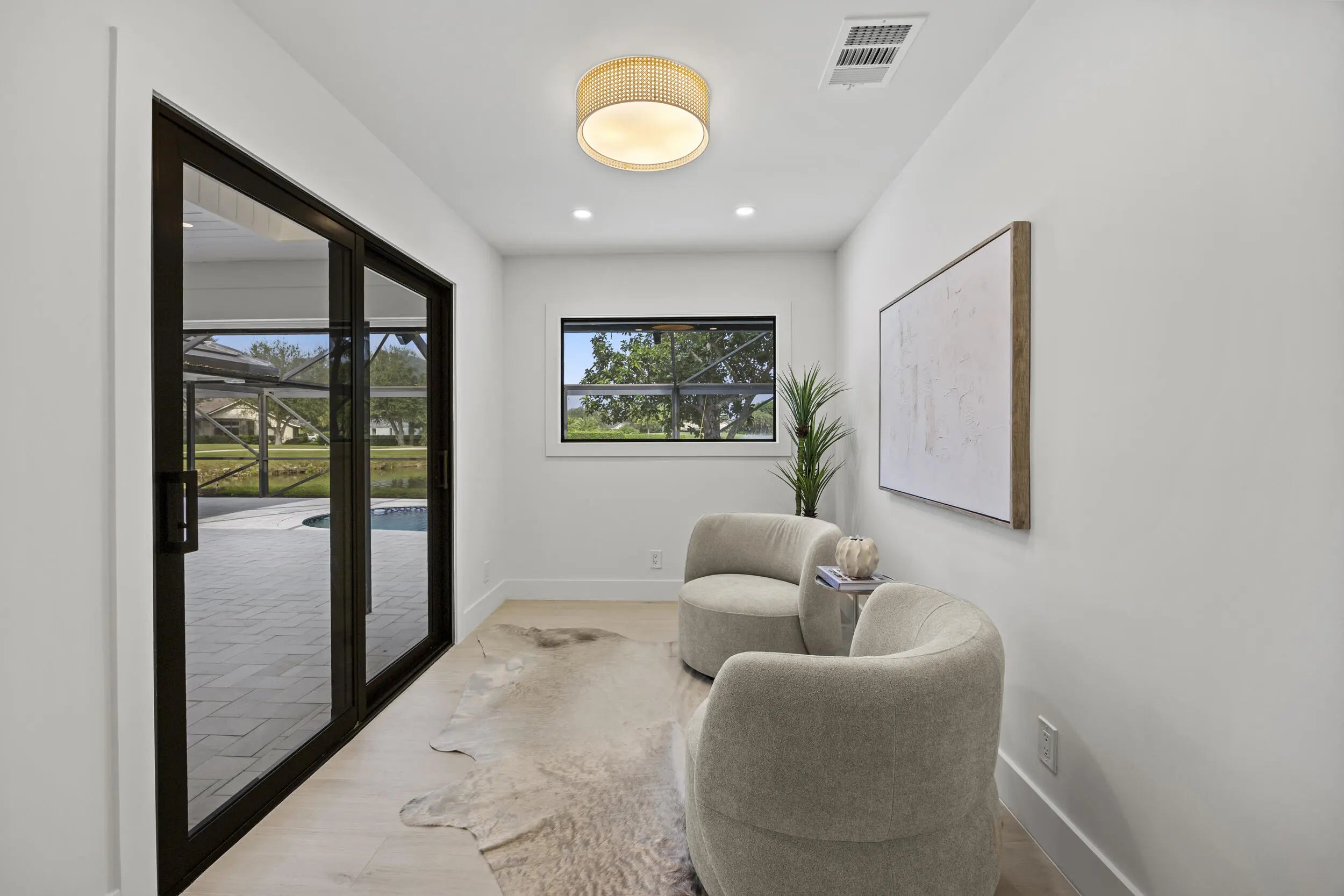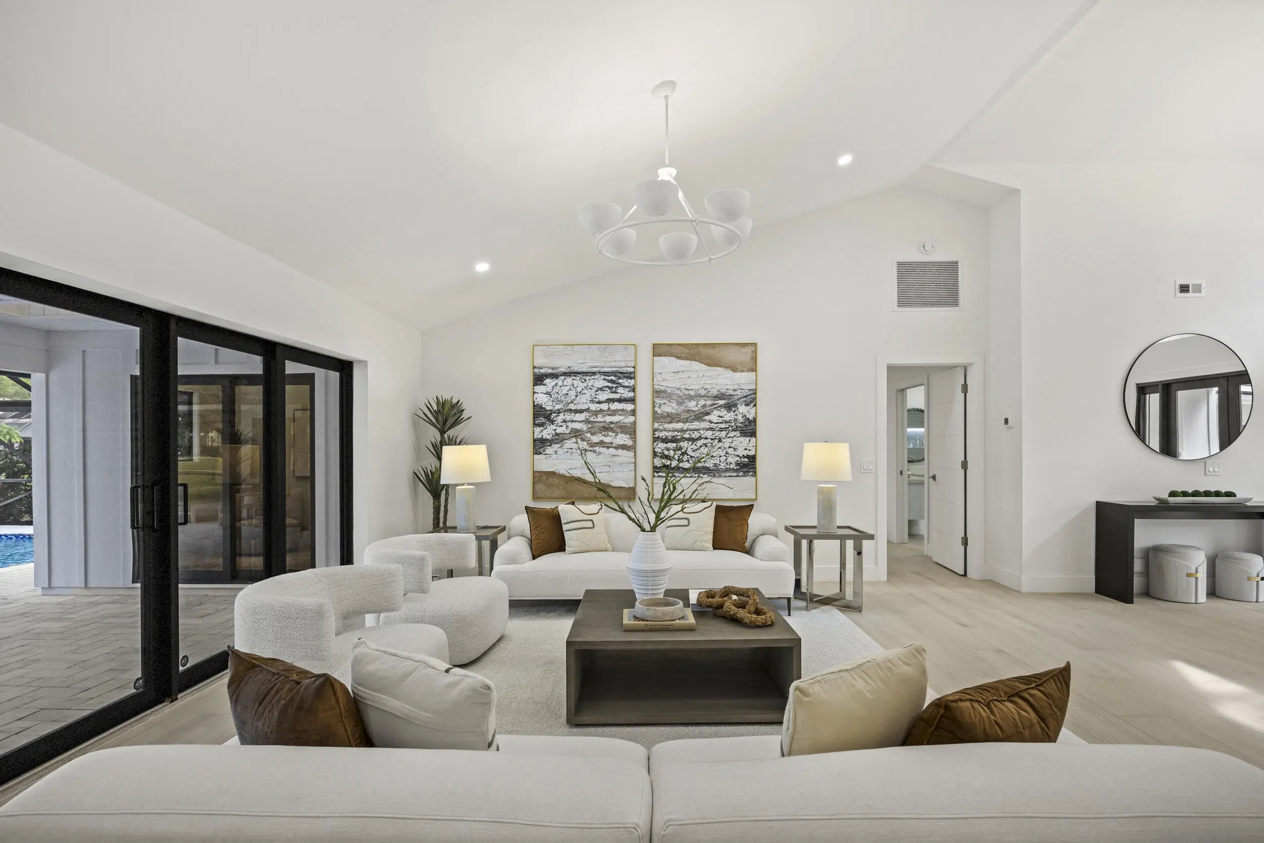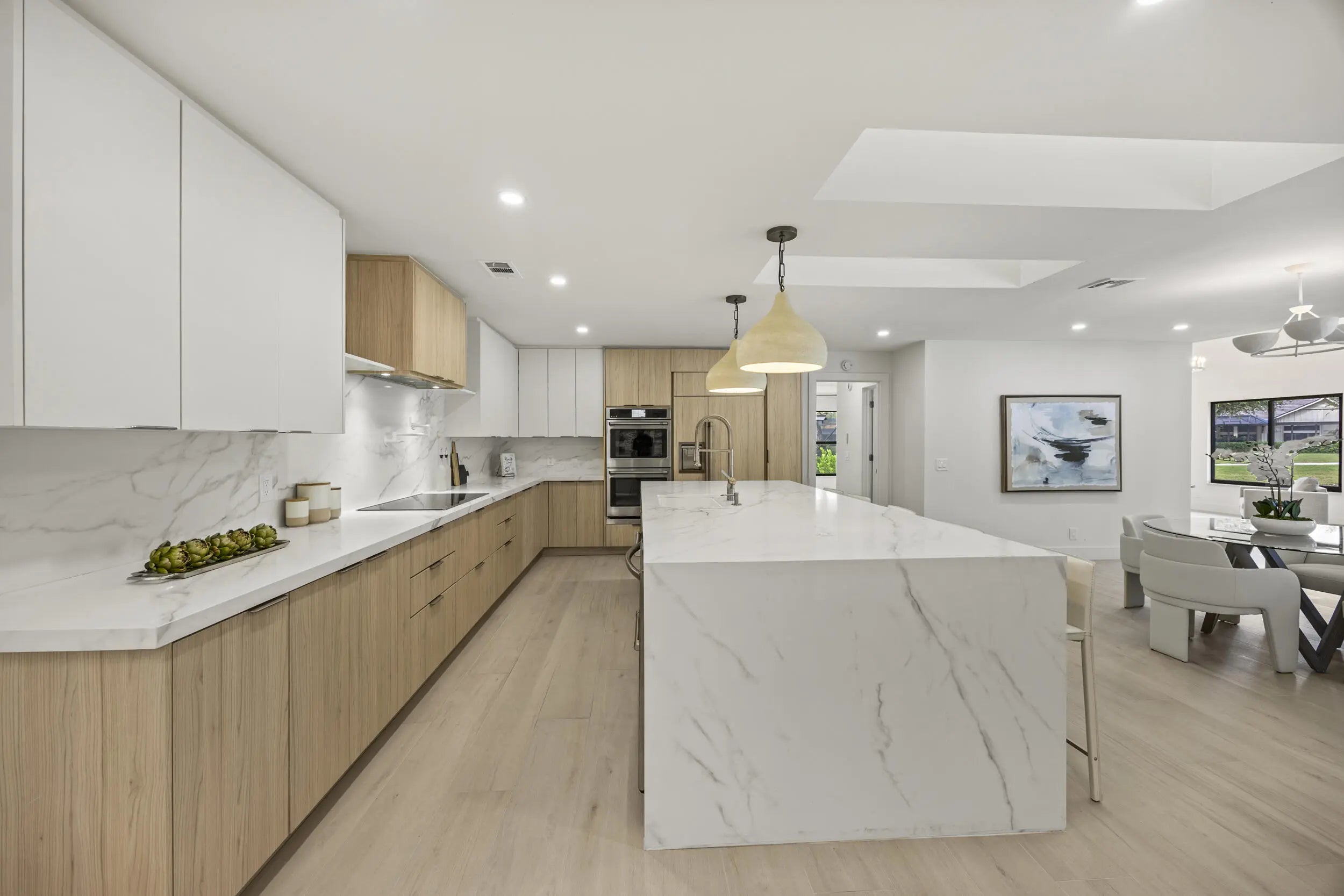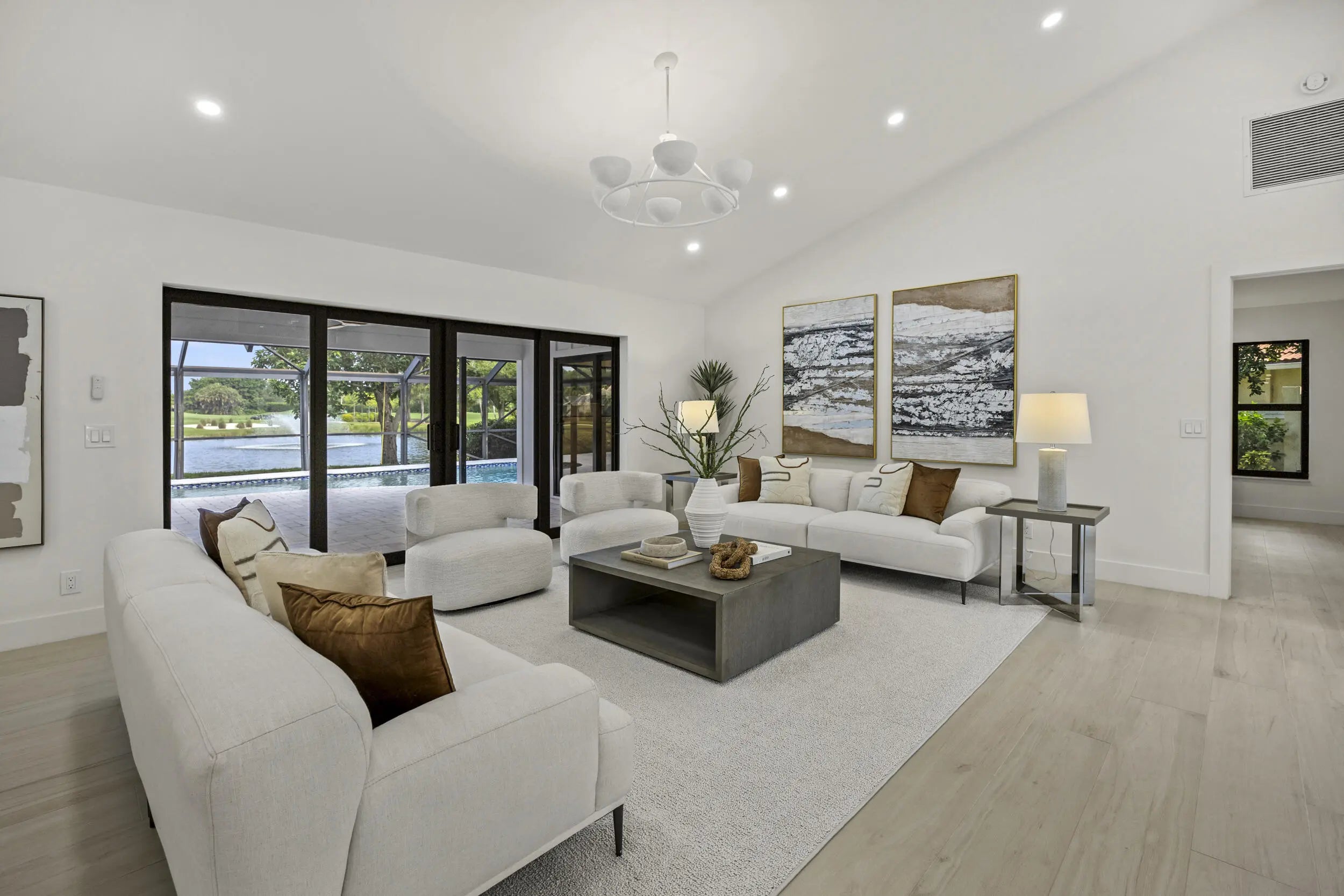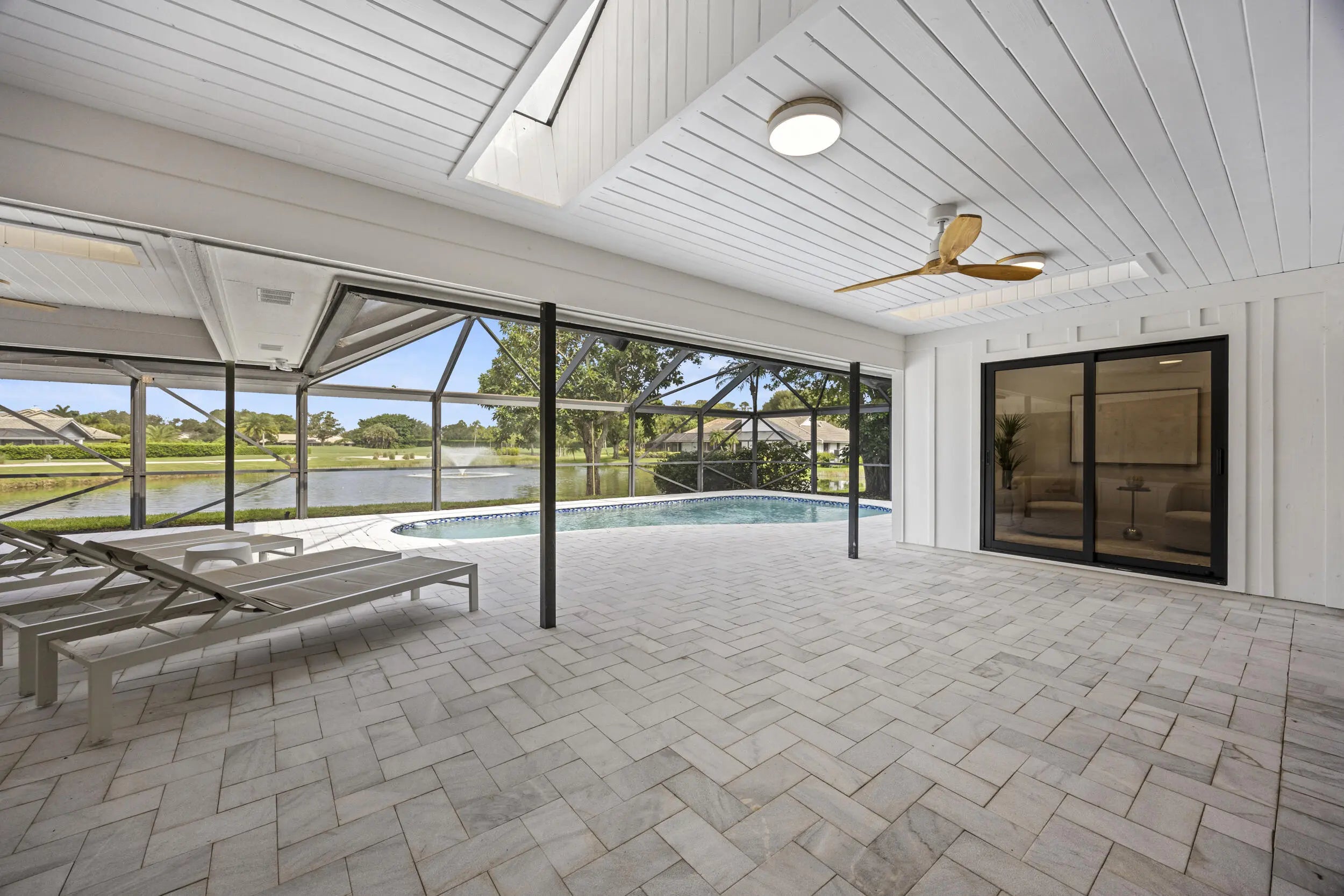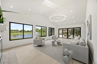 Discover refined luxury in this fully renovated 4,542 total sq. ft. estate, ideally located in the prestigious gated community of Burwick at PGA National. This 4-bedroom, 4.5-bath, 3-car garage residence blends modern elegance with timeless design & is truly move-in ready. Highlights include a brand-new concrete tile roof, newer A/Cs, impact doors and windows, Italian matte porcelain wood-look flooring, and designer lighting throughout. The private primary suite features serene pool and lake views, a spacious sitting area, custom walk-in closet, and a spa-inspired bath with curb less walk-in shower, freestanding tub, floating vanity, and smart toilet. The gourmet kitchen impresses with custom cabinetry, imported quartz countertops, waterfall island, floating shelving, and top-of-the-line