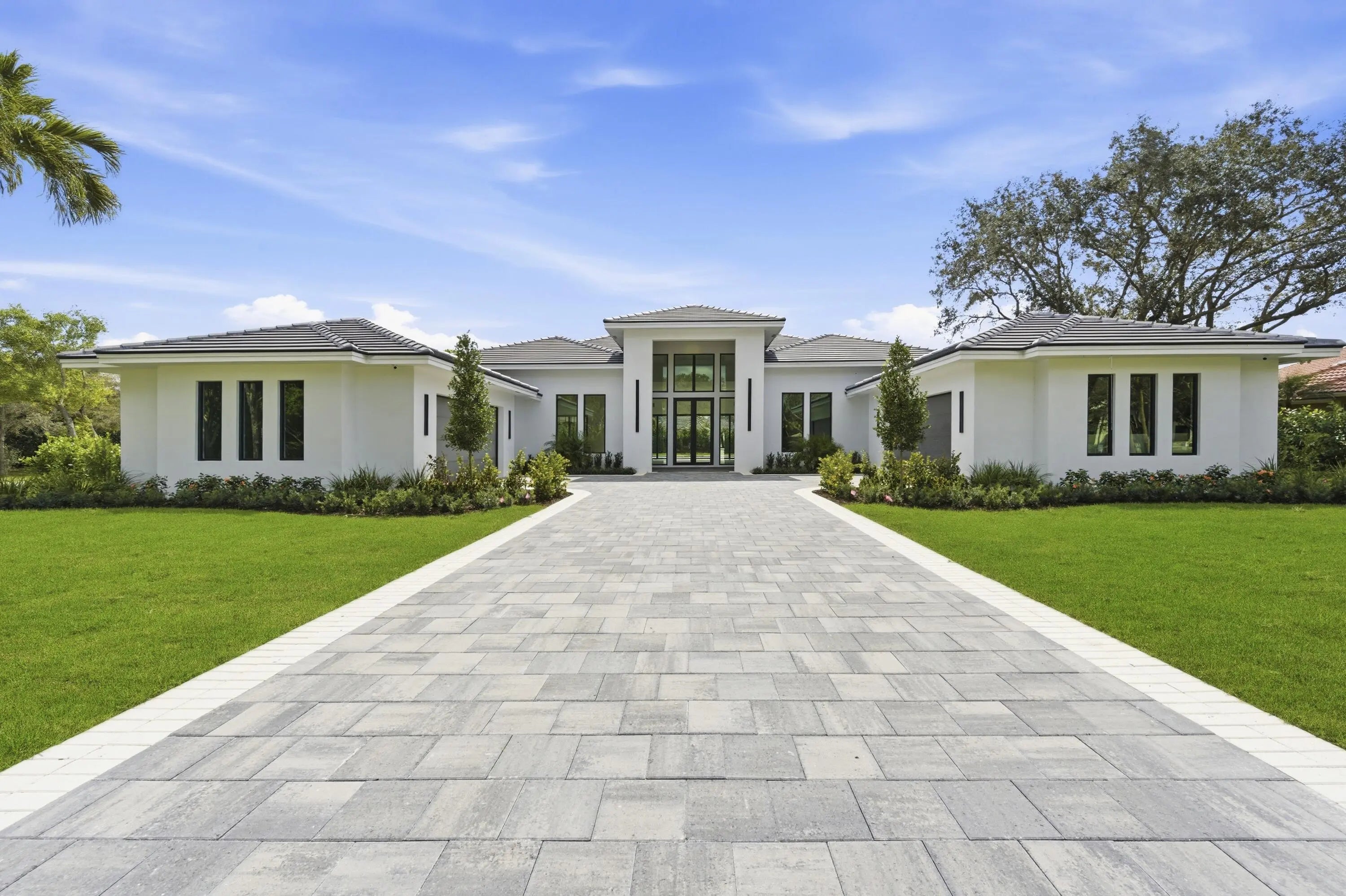 An exceptional new construction estate set on a prime lot within the prestigious, gated community of Steeplechase. This single-story residence offers 5 bedrooms, 5 full baths, two half baths. 4,993 sq ft of refined living space (6,930 total). A grand 17-foot foyer opens to a stunning great room with soaring 14-foot ceilings and walls of glass that seamlessly connect to a private courtyard oasis. Outdoor living is elevated with oversized porcelain pavers, artificial turf, and a 16 x 50 saltwater pool featuring sun shelves, deck jets, bubblers, spa, and an expansive covered patio with a 20-foot summer kitchen. The chef's kitchen showcases a 15-foot mitered quartz island, custom cabinetry, full backsplash, pantry, and a complete Sub-Zero/Wolf/Cove appliance suite.