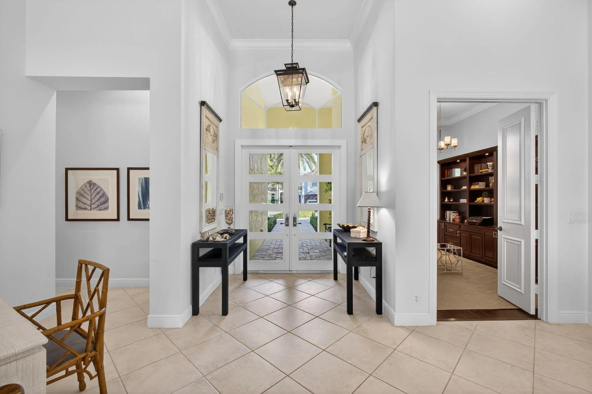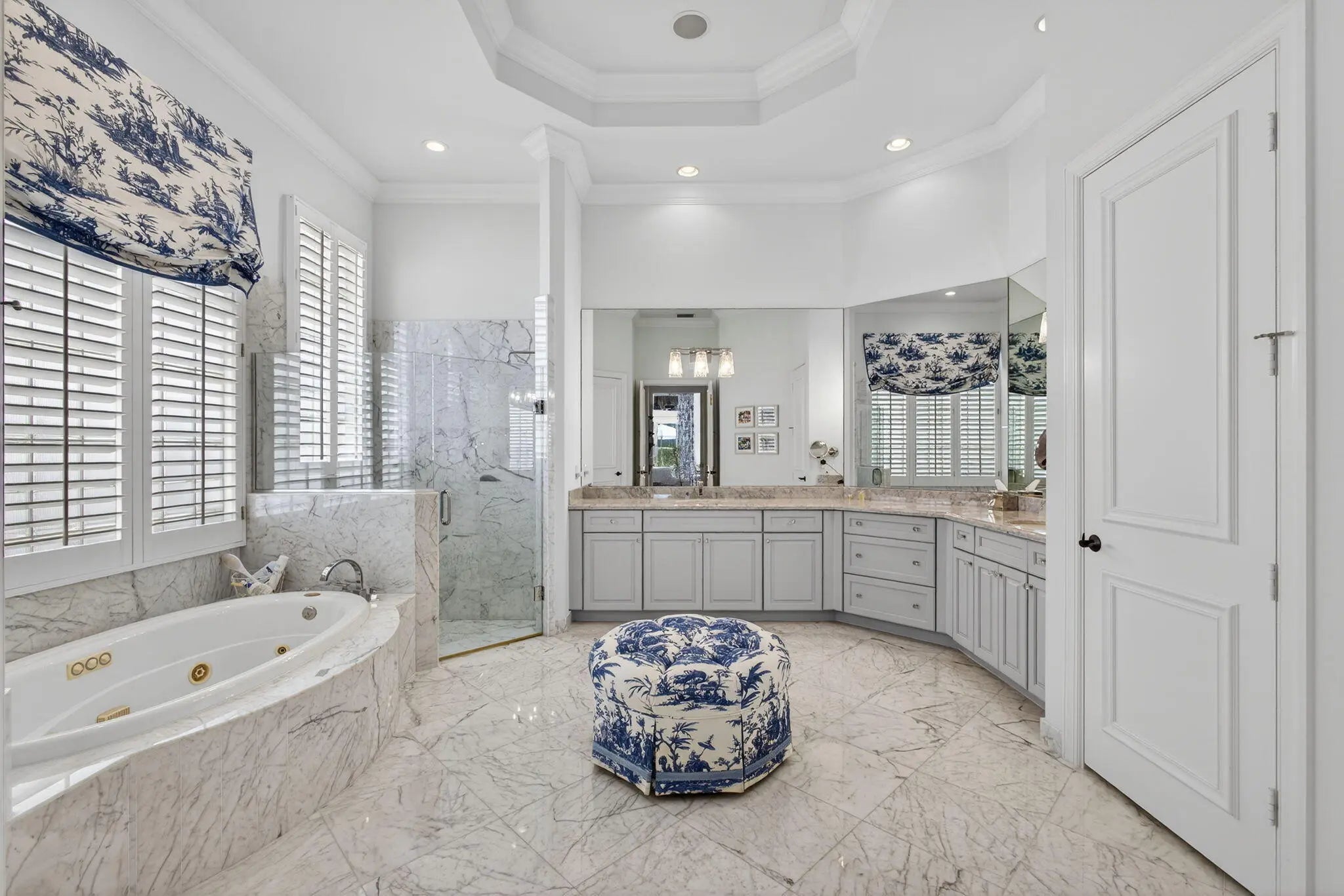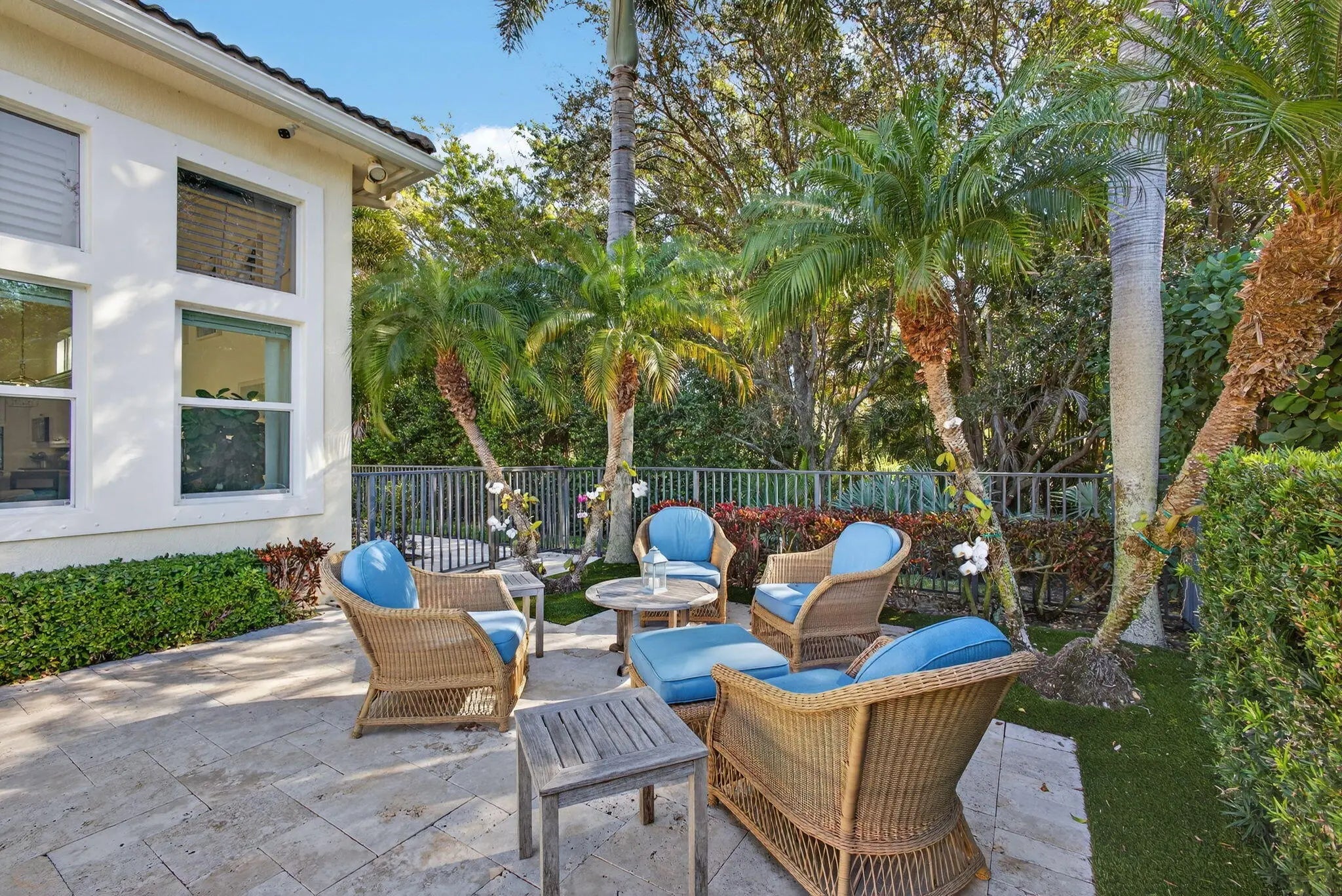 Nestled on one of the most private lots in Frenchman's Reserve, this exceptional one-story residence offers 3 bedrooms ans 3 1/2 baths in a serene cul-de-sac setting. With no neighbor on one side and a single-story home on the other, the property enjoys rare and remarkable privacy.A circular marble driveway creates a grand first impression, while the freshly painted exterior enhances the home's crisp, elegant curb appeal. Inside, the open-concept floor plan is light, bright, and thoughtfully designed for both everyday living and entertaining. Plantation shutters add timeless charm throughout.The white kitchen features neutral granite countertops, a butler's pantry, and seamless flow into the main living areas. Recent upgrades include a